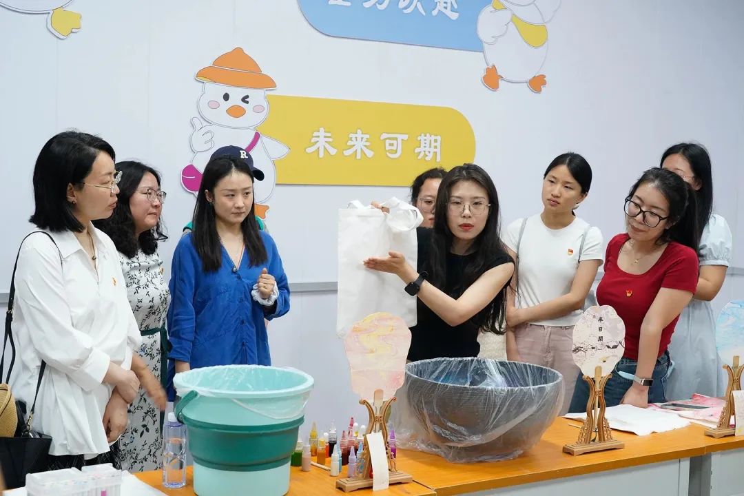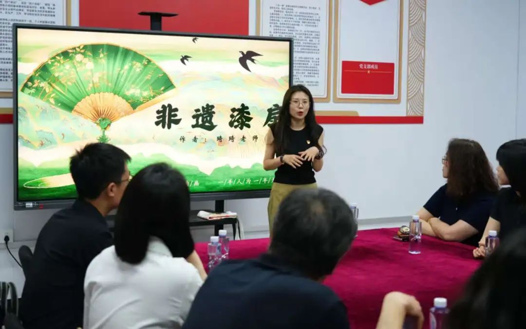 非遗专业教师孟琦详细阐述了中国漆艺的发展史以及非遗保护现状,解析了漂漆技艺中浮色原理、纹样创作等技法,并进行现场实践。实践环节还融入10分钟红色微党课,结合非遗作品解读“工匠精神、党员使命与廉洁操守”,让在场人员在欣赏作品的同时,深化党性教育和廉洁文化教育。