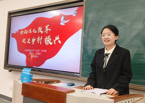 “红砖”宣讲团成员白晓凯从“乡村振兴好画卷”“深化改革好保障”“青年挺膺好力量”三个方面展开宣讲,围绕我国推进乡村振兴事业的奋斗历程和取得的伟大成就,重点解读了党的二十届三中全会关于乡村振兴的战略部署,号召广大青年以高度的历史使命感和责任感为推进乡村振兴贡献力量。