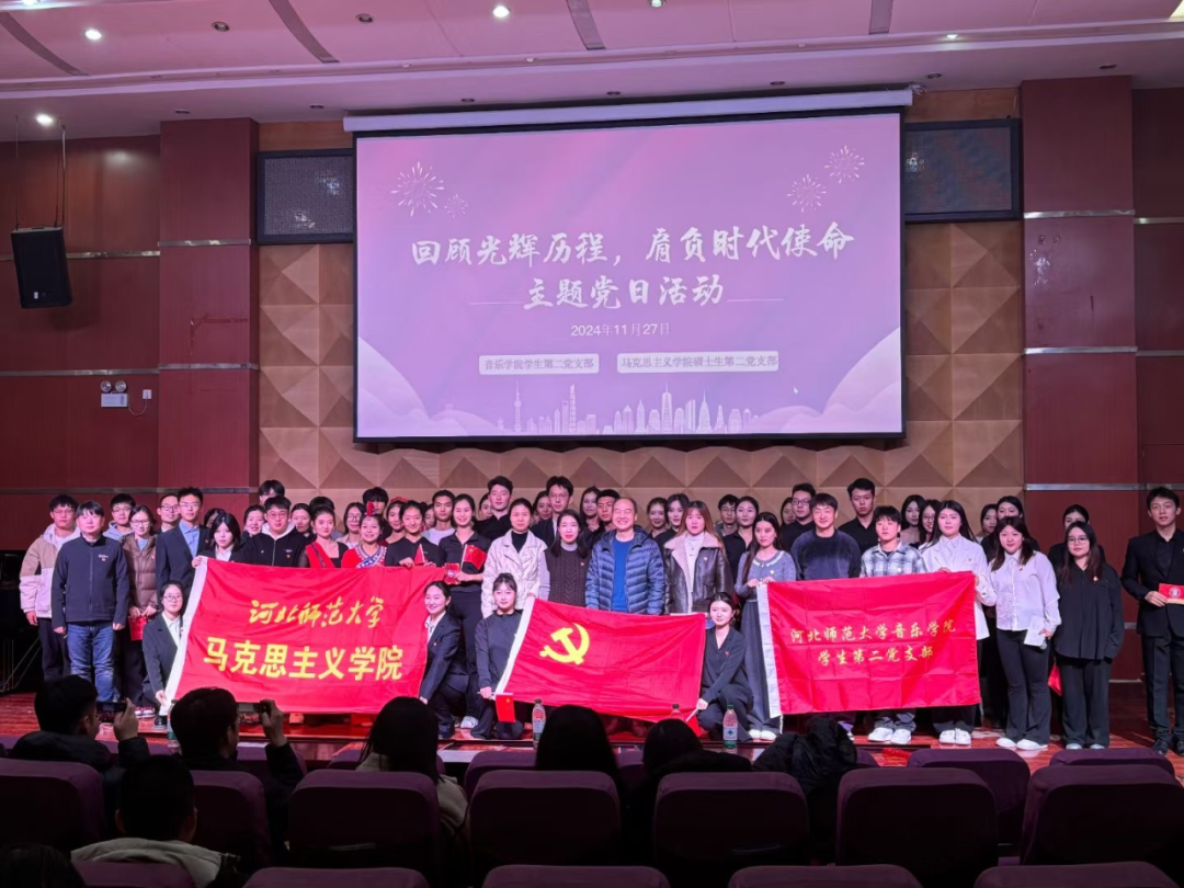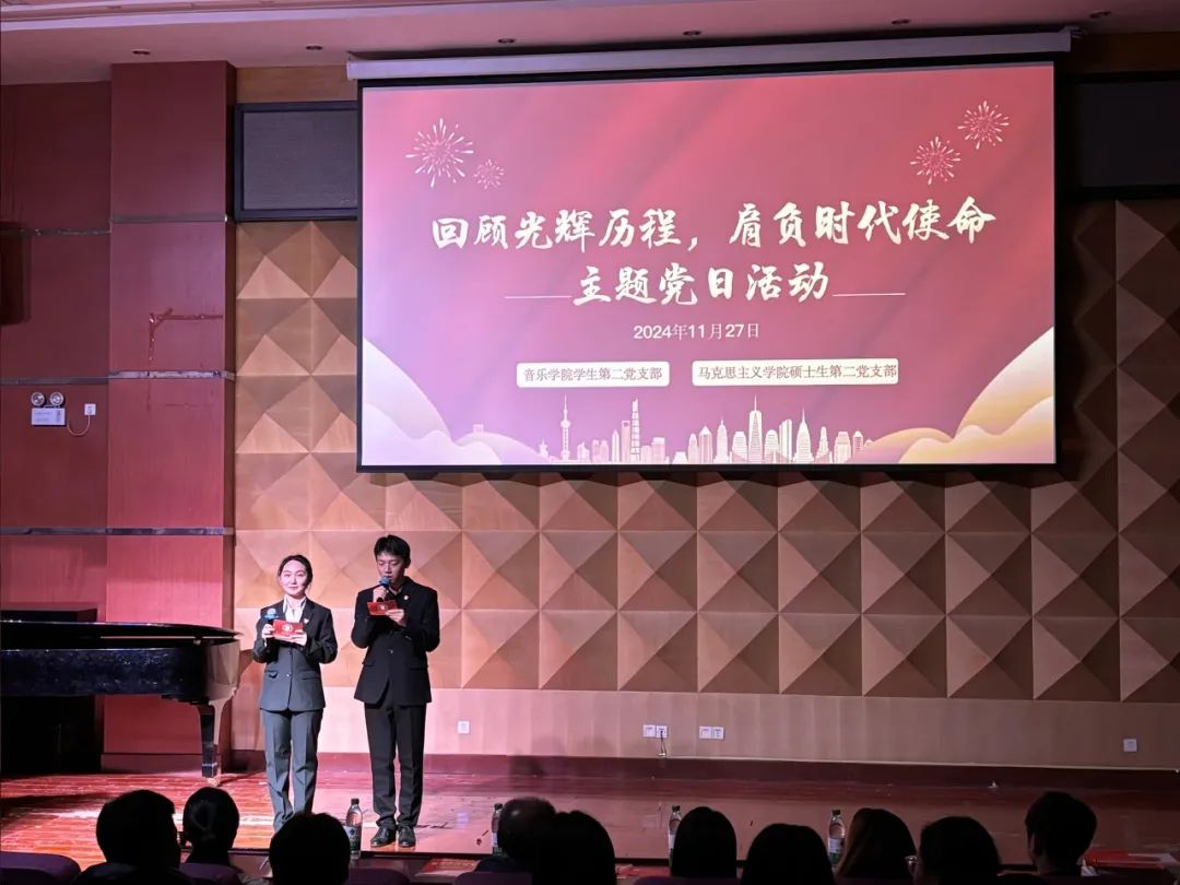 11月27日,AC米兰官方网站硕士生第二党支部与音乐学院学生第二党支部联合开展“回顾光辉历程,肩负时代使命”主题党日活动,以音乐舞蹈表演与理论宣讲相结合的形式,重温祖国75周年的辉煌历程,增强学生党员的历史责任感和使命感。AC米兰官方网站硕士生第二党支部与音乐学院学生第二党支部全体党员、部分入党积极分子共100余人参加活动。