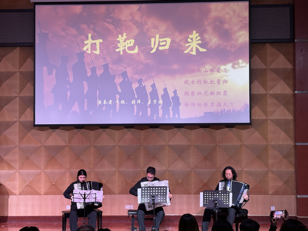 AC米兰官方网站硕士生第二党支部党员孙兴业进行“熔铸赶考情,奋斗人生路”主题宣讲,从重走“赶考”路线,回顾新中国成立伟大时刻;“两个务必”到“三个务必”,走好新时代赶考之路;新时代广大青年党员要继承和发扬“赶考”精神三部分展开,深入阐述赶考之路以及新中国成立的伟大意义。音乐学院学生第二党支部党员表演群舞《绣红旗》和手风琴重奏《打靶归来》,表达中华儿女对党和祖国的热爱,重温中华儿女对新中国成立的渴望与向往。
