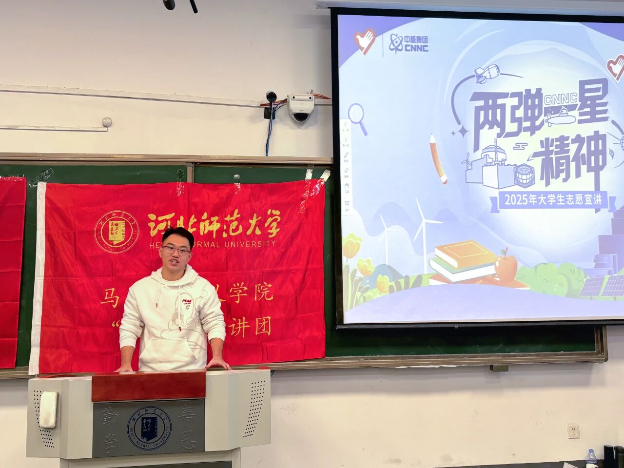 “红砖”宣讲团成员赵蓦晗以“两弹一星”精神为核心,从“第一颗原子弹成功研制历程”“王淦昌事迹”“郭永怀事迹”三个维度展开宣讲。回溯我国核工业从无到有的突破历程,以王淦昌、郭永怀等科学家隐姓埋名、以身许国的功勋事迹,深刻诠释了从“两弹一星”到“强核报国”一脉相承的奉献精神。激励青年学子以先辈为榜样,在强国建设中挺膺担当、贡献力量。