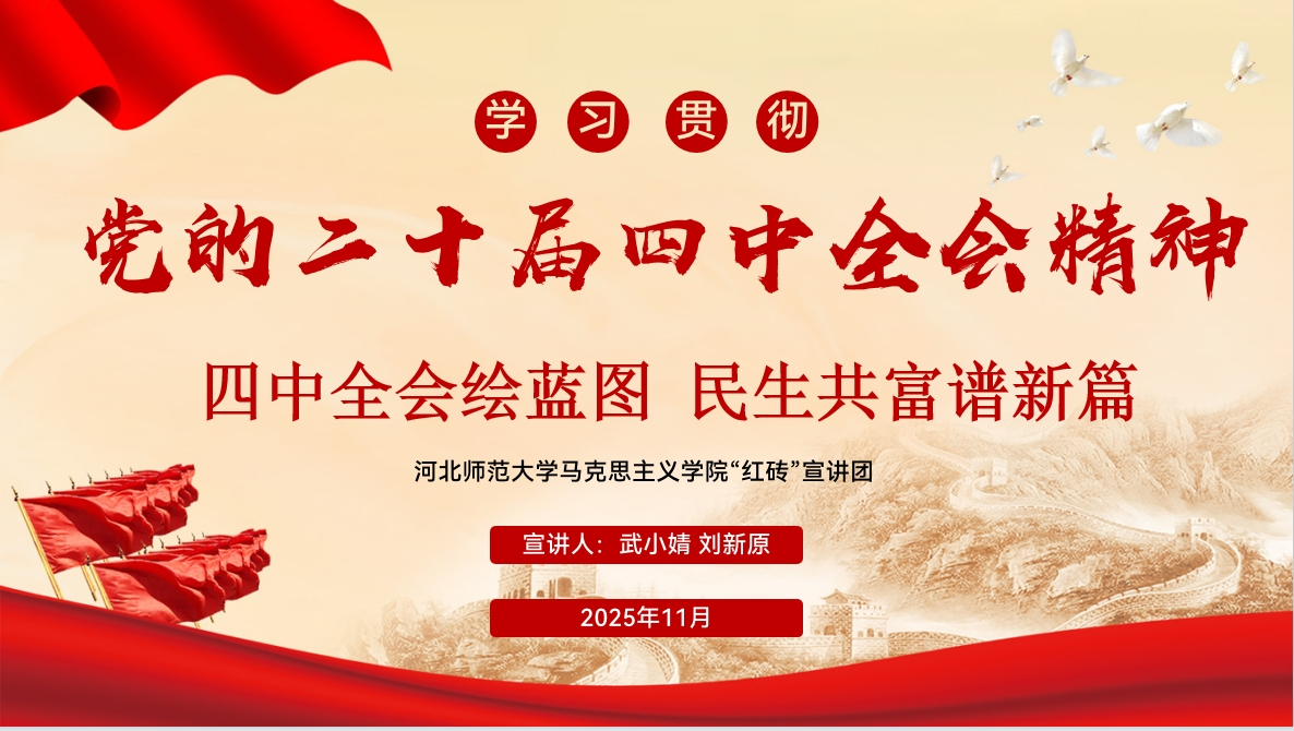主题简介:宣讲紧扣党的二十届四中全会精神核心,以“坚持以人民为中心”为根本遵循,围绕全会“加大保障和改善民生力度、扎实推进全体人民共同富裕”的重大部署,深入解读就业、教育、医疗、养老、住房等民生领域的政策导向与实践路径,阐释“十五五”时期增进民生福祉的重点任务。从政策顶层设计的时代内涵,到落地见效的民生温度,层层递进。旨在帮助听众精准领会全会要义,在感知民生政策温度的同时,凝聚起携手奋进、共赴共同富裕新征程的强大共识与行动力量。
